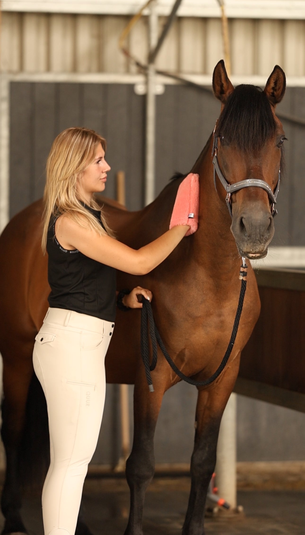 De roze poetshandschoen combineert stijl en functionaliteit. Dankzij de innovatieve nanozilvertechnologie verwijdert deze handschoen eenvoudig vuil en stof van je paard. Het zachte, duurzame materiaal is vriendelijk voor de huid van je paard en biedt een aangename poetservaring.